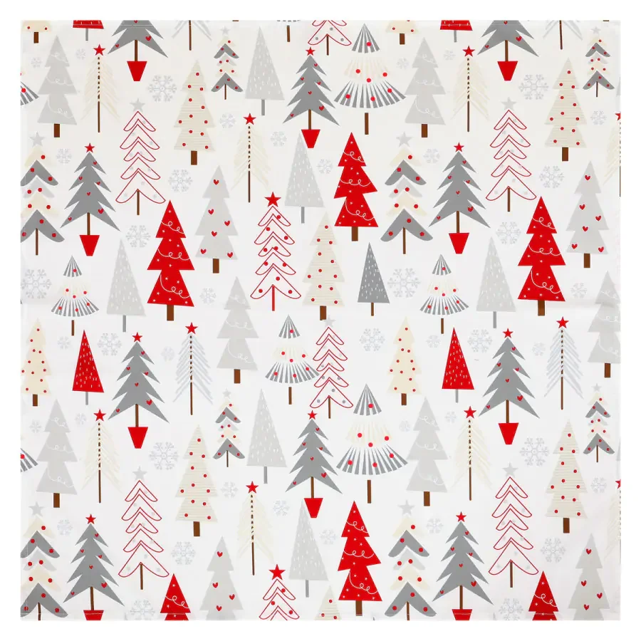 Přidejte sváteční šmrnc stolu díky ubrusu UBR101-3, který dodá interiéru jemný vánoční nádech. Je vyroben z 100% polyesteru a jeho rozměry 80 × 80 cm zajišťují ideální velikost pro menší i středně velké stoly. Na bílém podkladu se vyjímají stromečky v šedých a červených odstínech s různými vzory, což působí elegantně a svěže rozzáří prostor. Ubrus je praktický pro každodenní i slavnostní příležitosti a díky materiálu se snadno udržuje a rychle pere. Díky svým kontrastům a jemnému vzoru se stane skvělým doplňkem vaší vánoční výzdoby a dodá stolu osobitý šmrnc.