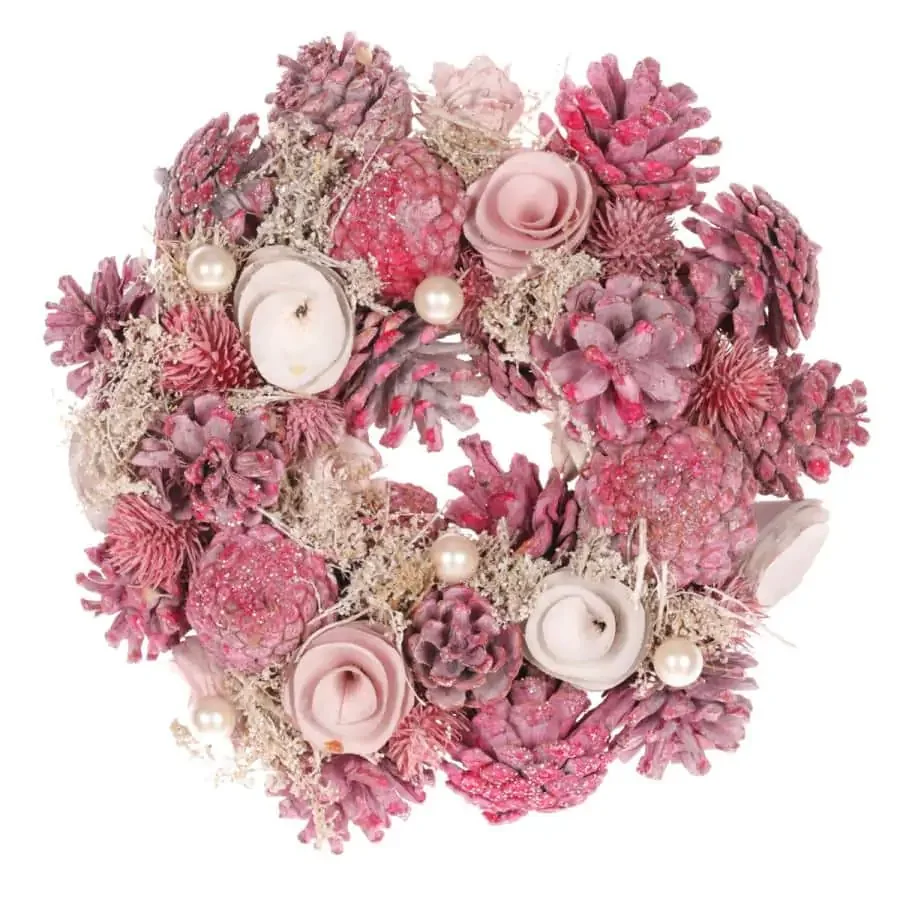 Růžový vánoční věnec zdobený perličkami, šiškami a jemně zpracovanými růžičkami dodá interiéru sváteční atmosféru. Vzhledem k tomuto aranžmá ho můžete pověsit na dveře nebo použít jako ozdobu slavnostního stolu a vytvořit tak příjemnou náladu.