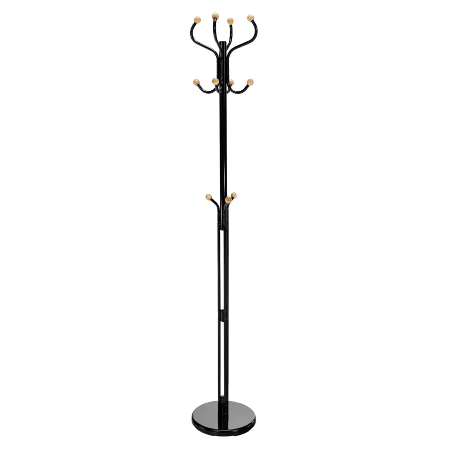 VASIL je moderní kovovo-dřevěný stojanový věšák, který kombinuje pevnou kovovou konstrukci s přírodními konci na věšácích. Jeho kovová část má lesklý černý vzhled, zatímco konce věšáčků jsou zakončeny autentickým dřevem, které dodává teplý vzhled a příjemnou atmosféru do vstupních prostor. Věšáky jsou určeny pro praktické a přehledné odkládání oděvů a doplňků v domě či v předsíni. Zboží se dodává v demontovaném stavu, montáž je rychlá a jednoduchá. Díky svému modernímu designu se hodí do různých bytových stylů a výborně doplní útulné i minimalistické prostory.