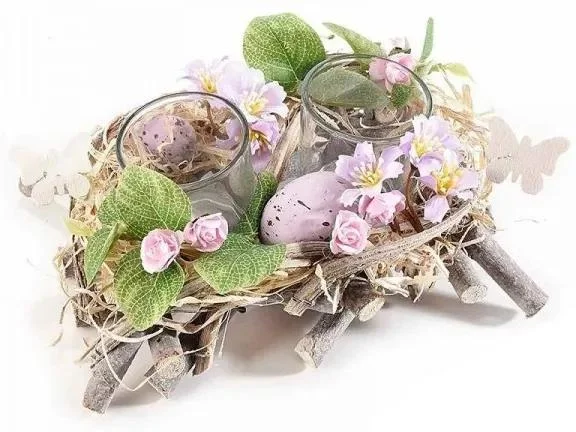 Oživte svůj velikonoční stůl s tímto elegantním svícnem v jemných růžovo-fialových barvách, který přináší veselou atmosféru. Ideální pro umístění dvou svíček, tento dekorativní kousek dodá vašemu interiéru příjemnou a slavnostní náladu.