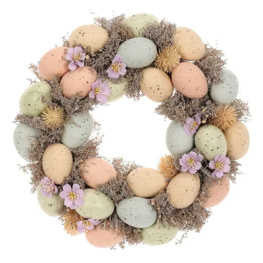 Věnec velikonoční PRK1004-L má průměr 30 cm a pevný proutěný základ. Je zdobený pestrými vajíčky, jemnými květy a tenkými větvičkami, čímž působí svěže a slavnostně. Tato dekorace je určena k dlouhodobému použití a nabízí variabilní možnosti umístění – lze ji pověsit na zeď nebo postavit na stůl, čímž rychle vytvoří jarní atmosféru. Díky vyváženému barevnému složení se hodí do různých interiérů a bude ozdobou během Velikonoc i po zbytek roku.