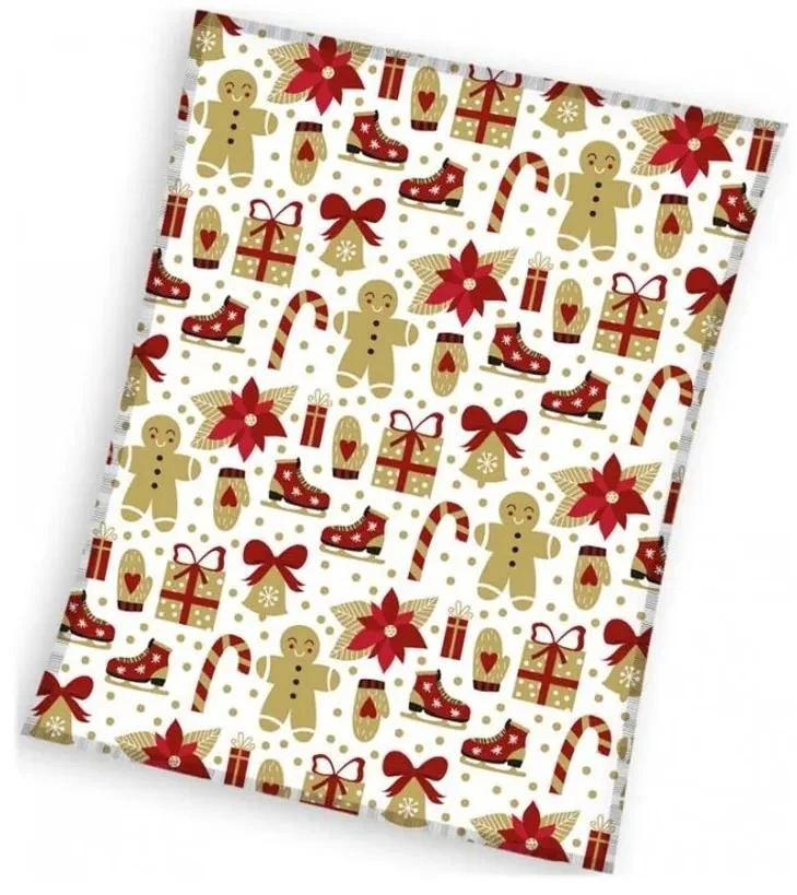 Oživte svůj domov kouzlem vánoční atmosféry s touto velkou, měkoučkou deku vyrobenou z příjemného coral fleece. Její rozměry 150 x 200 cm zajišťují dostatek prostoru na přikrytí a pohodlné užívání, zatímco vánoční motiv s obrázky dárků, perníčků, vánočních růží, bruslí a rukavic dodává interiéru slavnostní nádech.