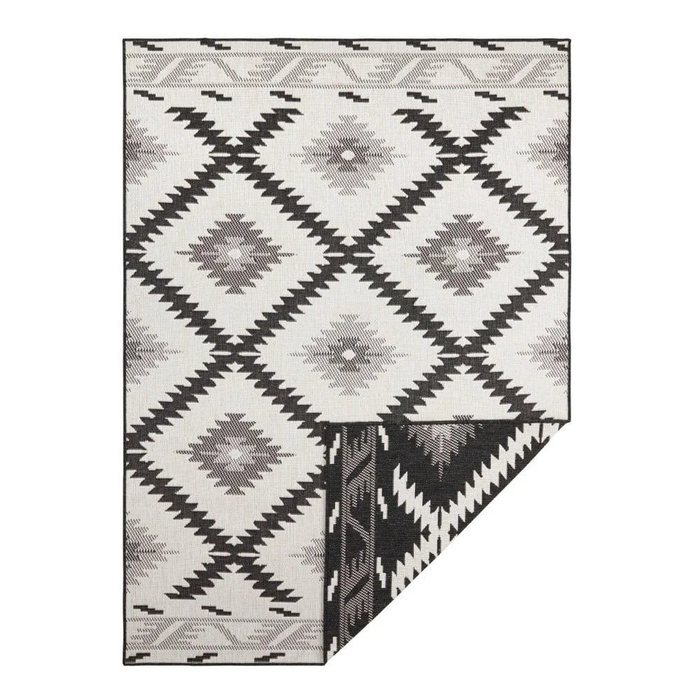 Venkovní koberec NORTHRUGS Malibu v elegantní černo-krémové kombinaci je ideálním doplňkem pro vaši terasu, zahradu nebo u bazénu. Vyroben je z odolného polypropylenu, který odolává vodě, nečistotám i vyblednutí barev, což zaručuje dlouhou životnost i při venkovním použití.