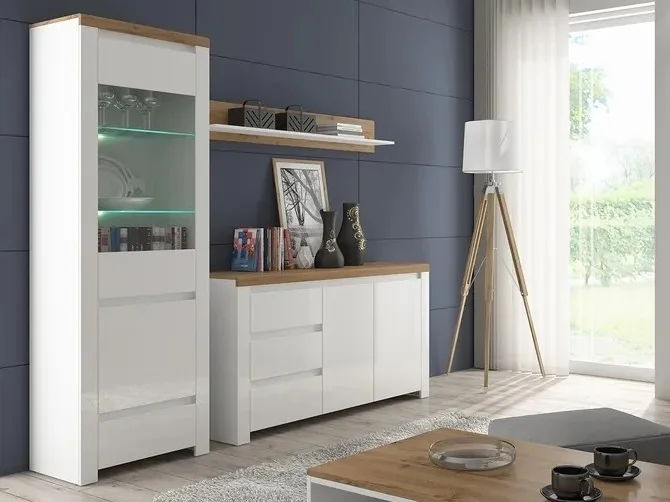 Ukázková sestava obývacího pokoje ze sektorového systému VENUSTA kombinuje bílý lesk dvířek s horní deskou v dekoru dub Wotan. Sestavu lze zakoupit díl po dílu, takže si ji snadno přizpůsobíte prostoru a vkusu. Do soupravy patří vitrína 1D1W1S o rozměrech 68 x 202 x 41,5 cm, police 150 x 21 x 20 cm a komoda 2D3S s rozměry 156 x 84,5 x 41,5 cm. Barva a povrch: dvířka bílý lesk, horní deska dub Wotan, korpus bílé barvy. Materiál: laminovaná dřevotříska s ABS hranami; dvířka jsou z MDF. LED osvětlení není součástí ceny. Dodáváno v demontu. Díky modulární konstrukci systém jednoduše přizpůsobíte rozvržení prostoru a získáte čistý, moderní vzhled — skvěle se hodí do menších i prostornějších obývacích pokojů.