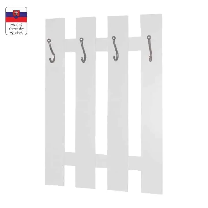 Věšáková stěna z laminované dřevotřísky v bílé barvě nabízí čtyři praktické úchyty pro zavěšení kabátů a doplňků. Materiál je odolný a snadno se čistí, což prodlužuje životnost stěny. Úchytky jsou vyrobeny z plastu, což zajišťuje lehké používání a nízkou pořizovací cenu. Dodávána v demontu, montáž doma je rychlá a jednoduchá.