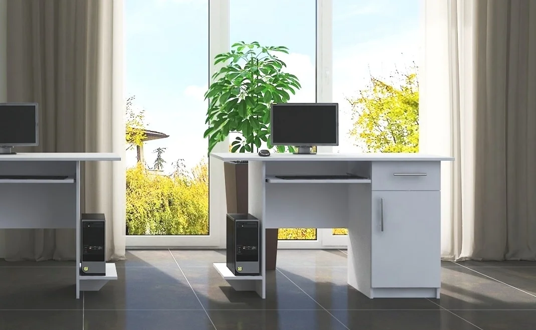 Pracovní stůl s dvířkami a zásuvkou na pravé straně má čistý, praktický tvar, který se hodí do moderního interiéru. Díky kompaktním rozměrům šetří prostor a skvěle zapadne i do menších pracovišť.
