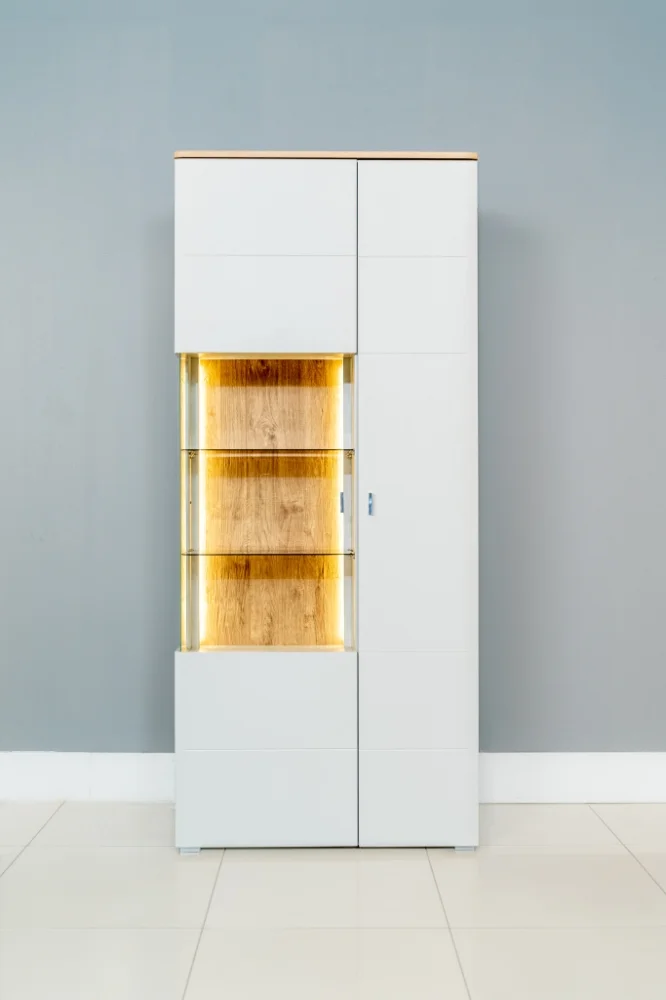 Povrch tvoří odolné lamino/sklo, které je snadno udržovatelné a působí svěže. LED osvětlení není součástí balení a výrobek je dodáván v demontu. Pro dokonalý dojem zvolte vhodné osvětlení a doplňky, vitrína se hodí k moderním i skandinávským interiérům. Po sestavení poskytne stabilní a stylový úložný prostor pro každodenní použití.