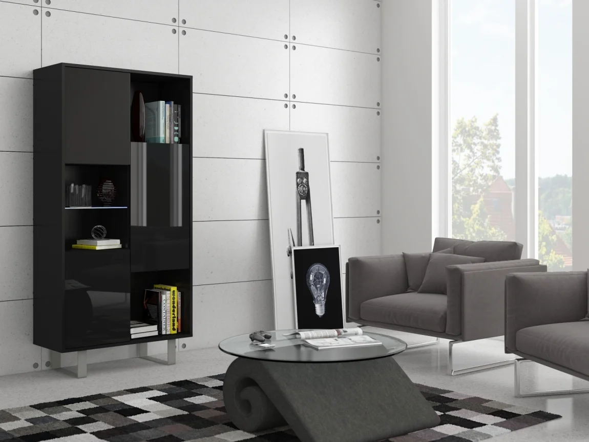 Vitrína Bokaro 6 v elegantním černém provedení s vysokým leskem skvěle doplní každý moderní interiér. Rozměry 80 × 165 × 36 cm poskytují dostatek místa pro vystavení i praktické uspořádání drobností.