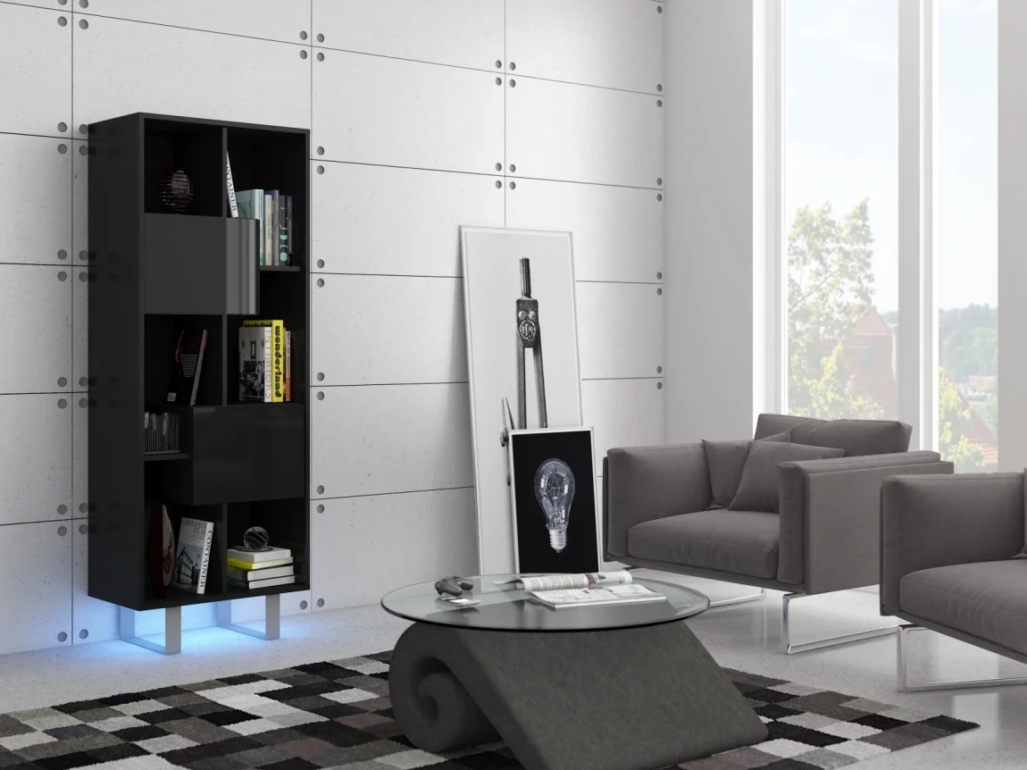 Vitrína BOKARO 7 v černém lesku dodá interiéru moderní vzhled a praktické úložné prostory. Rozměry 60 × 165 × 36 cm (š × v × h) potvrzují pevnou konstrukci z LTD desky o tloušťce 16 mm, která zajišťuje dlouhou životnost.