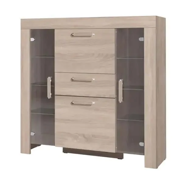 Vitrína Cezanne R7 je vyrobena z kvalitního lamina v odstínu Sonoma a nabízí kombinaci prosklených i uzavřených dvířek, která vytváří variabilní úložný prostor. Díky pečlivému zpracování poskytuje dostatek místa pro talíře, sklo a dekorace, a zároveň působí elegantně.