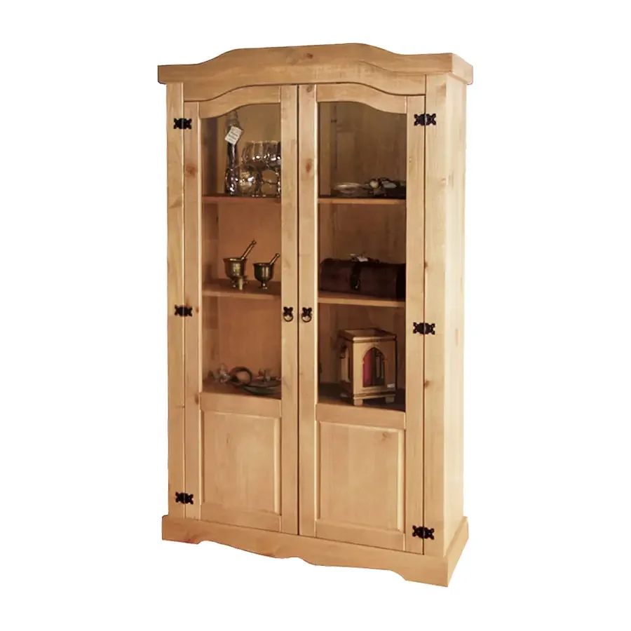 Vitrína CORONA z masivní borovice je provedena v teplém medovém odstínu, který dodává nábytku nadčasový charakter. Má dvě prosklená dvířka, za nimiž se ukrývají praktické police pro vystavení nádobí, skla či dekorací. Na dvířkách jsou kovové ozdobné úchytky, které dotvářejí elegantní a stylový vzhled. Zboží je dodáváno v demontu, což usnadňuje dopravu a montáž; návod je součástí balení. Vybírejte tuto vitrínu, pokud hledáte spojení přehledného úložného prostoru a designového doplňku, který zároveň působí přirozeně a útulně.