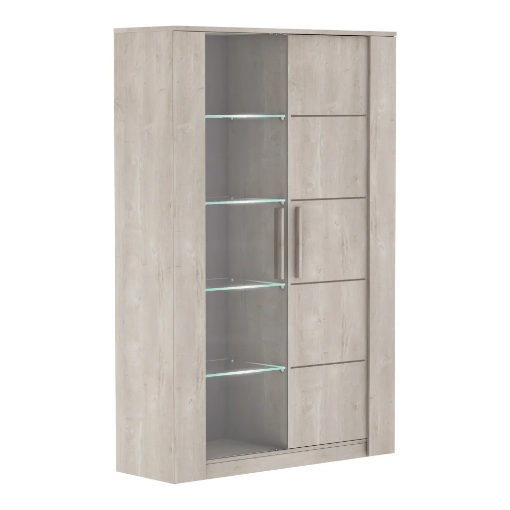 Skleněné police o tloušťce 4 mm jsou osazeny integrovaným LED osvětlením, díky němuž se vystavené předměty působivě rozzáří. Rozměry (š x v x h): 114 x 175,8 x 39,6 cm; materiály: lamino, dekory ze 100 % melaminu (vlhkuvzdorné); korpusy 15 mm, horní deska 22 mm, rukojeť potažená MDF. Vnitřní úložný prostor tvoří 4 skleněné a 4 lamino police. Dodáváno v demontu. Vhodná do obývacího pokoje či jídelny pro elegantní prezentaci dekorací a servisů a díky osvětlení si zachová i příjemnou atmosféru při slabším světle.