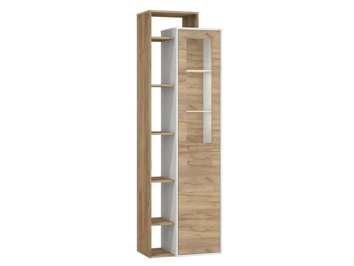 Vitrína Dorinda kombinuje moderní vzhled s praktickým prostorem pro vystavení nábytku. Dodává se v provedení levé a její barevné provedení kombinuje craft bílý a craft zlatý, což vytváří elegantní dvoubarevný efekt.