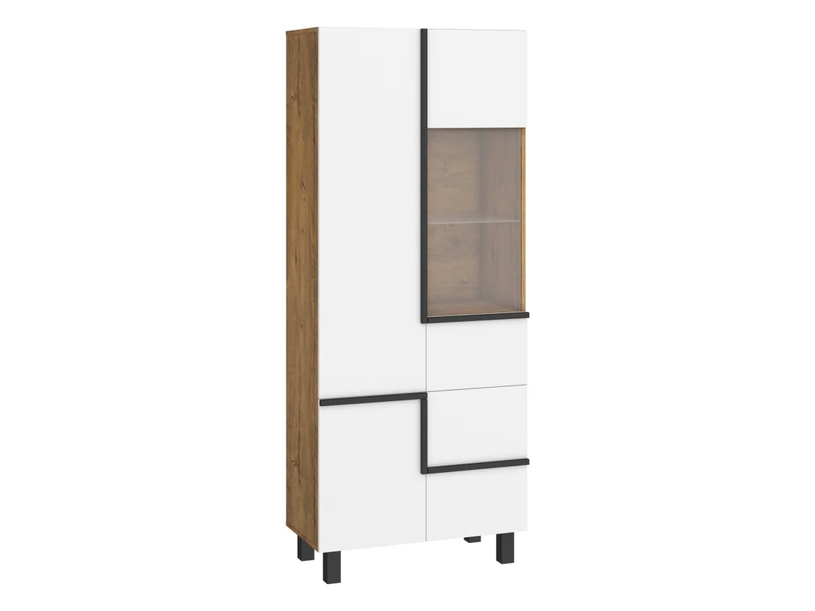 Vysoká vitrína DZENGAL 3D spojuje uzavřené i prosklené prostory do jedné praktické skříně. Ve spodní části je jedna polička za plnými dvířky, nad ní jsou uvnitř tři police. Za prosklenými dvířky se nachází jedna skleněná polička a dvě police z lamina.