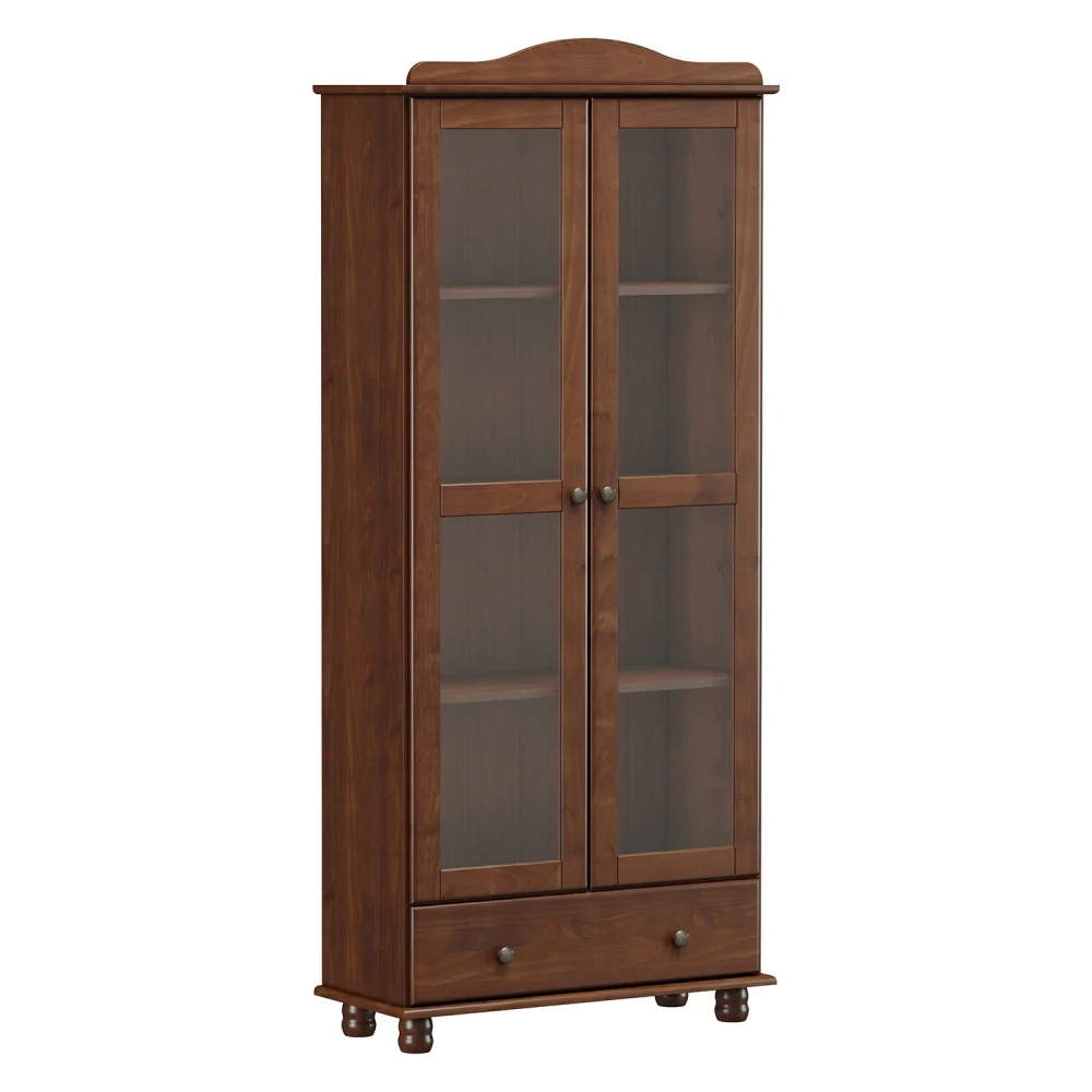 Vitrína EONI v tmavě hnědém odstínu je vyrobená z masivní borovice a kombinuje přírodní vzhled s dlouhou odolností. Uvnitř najdete tři police a dveře s proskleným panelem, které umožní stylové vystavení vašich předmětů. Široká zásuvka s kovovými pojezdy zajišťuje plynulé otevírání a spolehlivý úložný prostor pro drobnosti. Rozměry: 85 cm (šířka) x 193 cm (výška) x 35 cm (hloubka). Dodáváno v demontu pro pohodlnou přepravu a montáž doma.