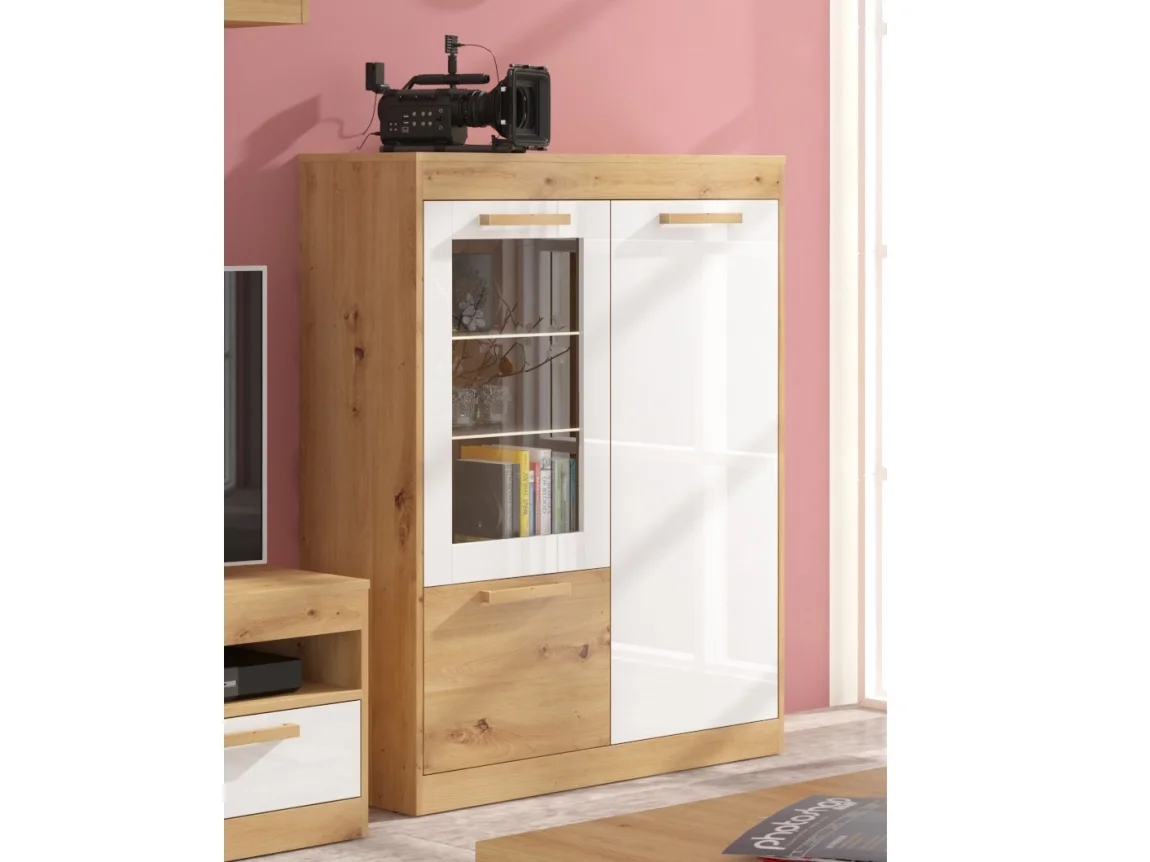 Vitrína s prosklenými dvířky skvěle doplní moderní interiér a poslouží k vystavení dekorací i drobného skla. Rozměry 100 x 121 x 36 cm (š x v x h) zajišťují dostatek místa, aniž by působila přeplněně.