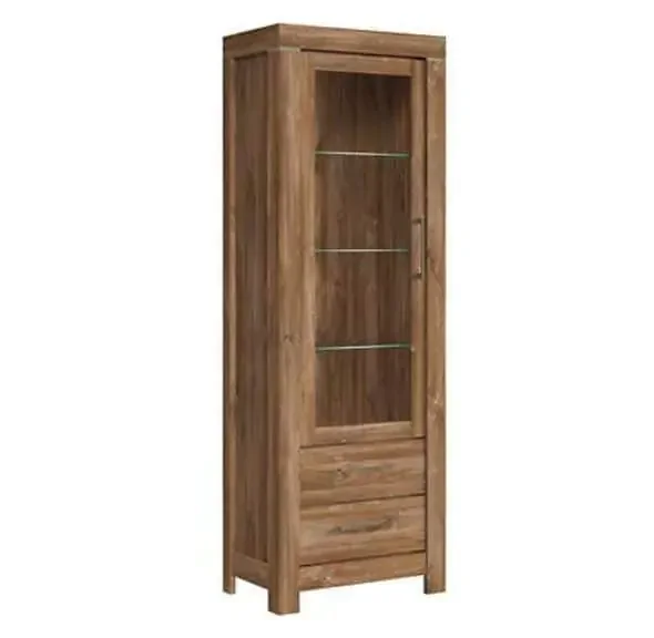 Vysoká vitrína GENT REG1W2S/20/7 nabízí bohatý úložný prostor díky kombinaci polic a zásuvek. Je zhotovena z dřevotřísky a MDF lamely s povrchovou folií a laminátem, doplněná kovovými úchyty a tichým dovíráním dveří.