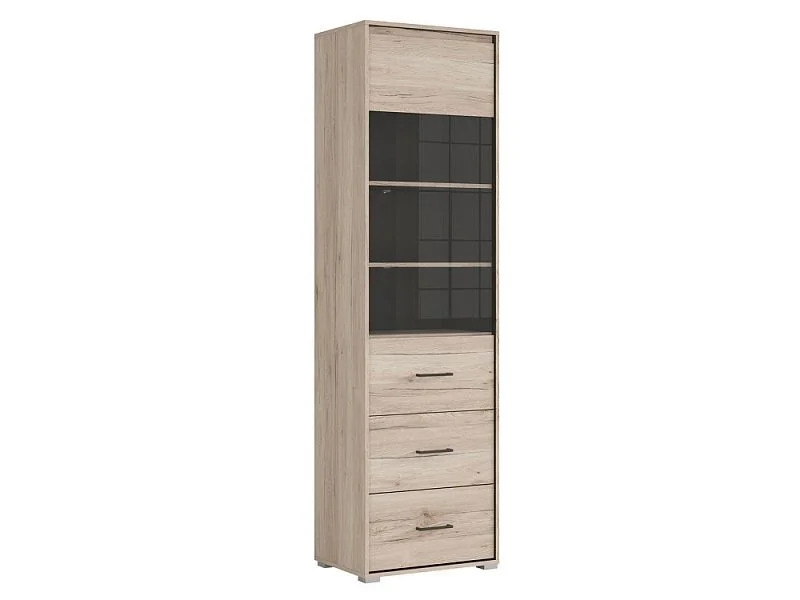 Vitrína GOFRY kombinuje světlý dub San Remo s šedou barvou wolfram, což dodává moderní a nadčasový vzhled interiéru. Rozměry (š x v x h) 56 x 40,5 x 197 cm a materiál lamino zaručují pevnost a snadnou údržbu.