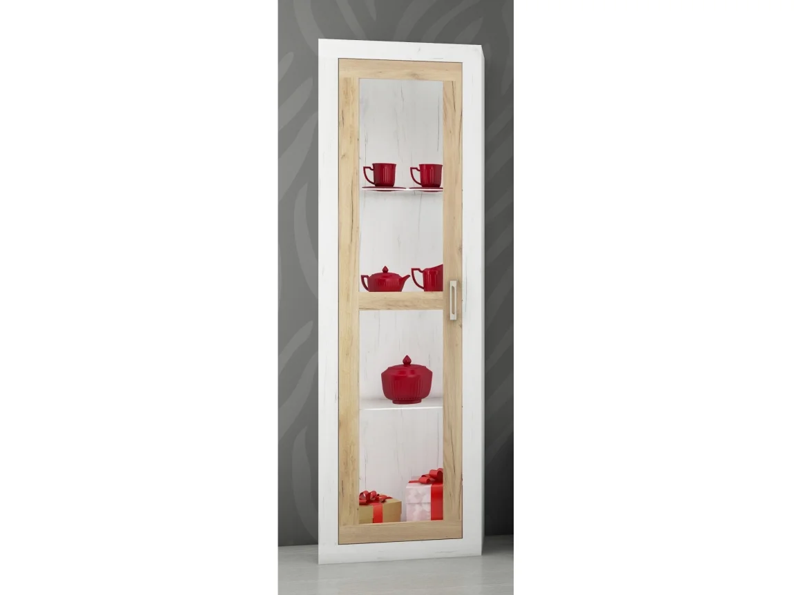 Vitrína GOUDINI v provedení Craft bílé a Craft zlaté představuje stylový doplněk pro každou místnost a expozici. Je vyrobená z odolného lamina 16 mm, což zajišťuje pevnost i snadnou údržbu. Rozměry: 60 cm šířky, 198 cm výšky a hloubka 34 cm poskytují dostatek prostoru pro vystavení i ukládání předmětů. Stříbrné úchyty jsou vyrobeny z tvrzeného PVC a dotvářejí moderní vzhled. Dodává se v demontu, což usnadňuje dopravu a montáž na místě. 5 let záruka na bezproblémové používání zajišťuje klid při každodenním použití.