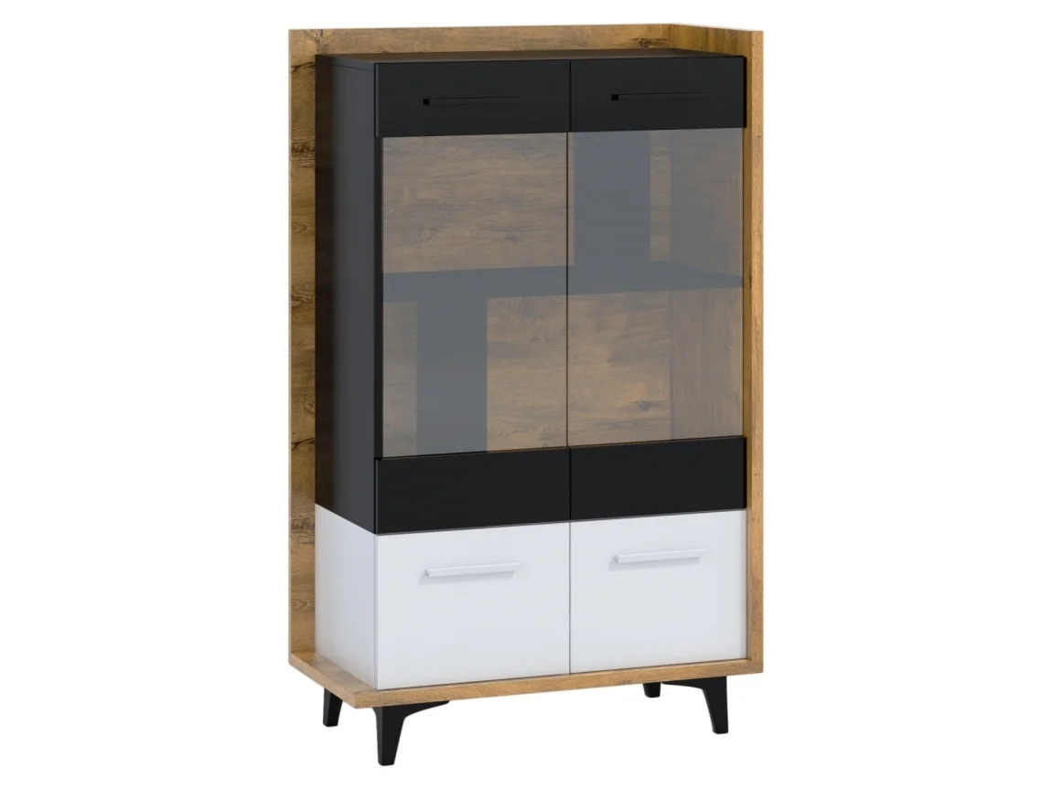 Vitrína KNUT 2D disponuje dvěma prosklenými dvířky a dvěma plnými dvířky, které umožní stylové vystavení i praktické ukládání. V barevném provedení kombinuje dub burgundský s bílou a černou.
