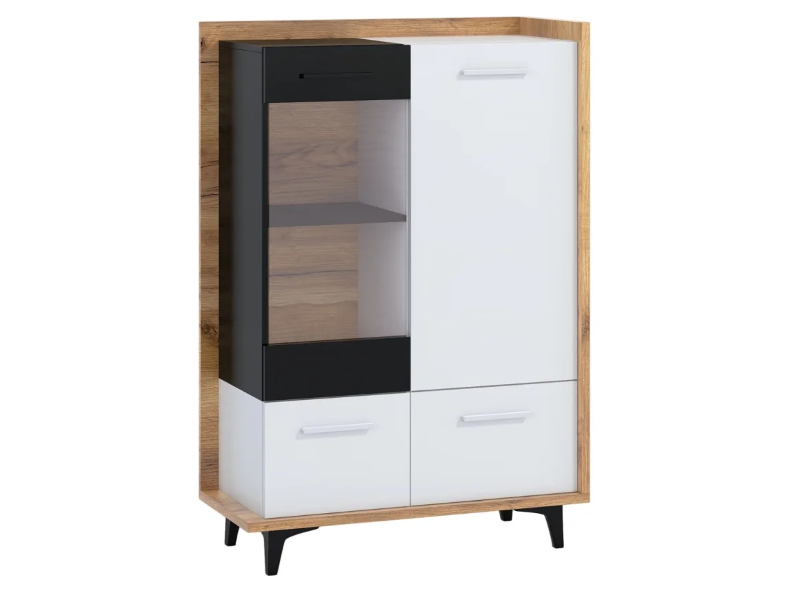 Vitrína KNUT 3D nabízí kombinaci tří plných dvířek a jednoho proskleného dílu ve stylu craft zlatá/bílá/černá. Rozměry: 95 × 139 × 42 cm (š × v × h). Konstrukce vychází z laminovaných desek o tloušťce 16 a 25 mm s ABS hranami a bezpečným sklem, což zajišťuje dlouhou životnost a snadnou údržbu.