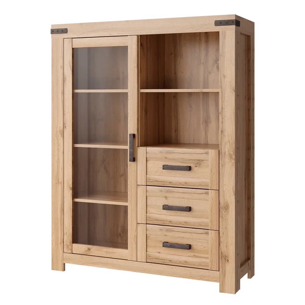 Vitrína LIBERATA 1W3S v provedení dub wotan kombinuje moderní vzhled s praktickým úložným prostorem. Prosklená část s dvířky z MDF poskytuje přehledný pohled na vystavené předměty a zároveň chrání obsah před prachem.