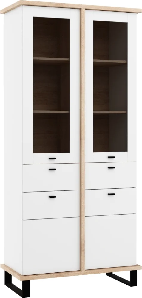Vitrína z kolekce ORSOLA kombinuje stylový vzhled s praktickým úložným prostorem v provedení dub sonoma a bílá. Disponuje dvěma zásuvkami a čtyřmi skříňkami: dvě s plnými dveřmi a dvě s prosklenými dvířky, uvnitř je celkem šest polic.