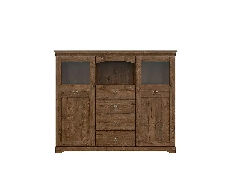 Vitrína Patras KOM2W4S v dekoru dub April je určena pro milovníky tmavého nábytku a tradičního vzhledu. Nabízí výrazný úložný prostor ve třech částech, přičemž uprostřed je zásuvková část a po bocích najdete dvířka se policemi a průhledným panelem z tvrzeného skla.