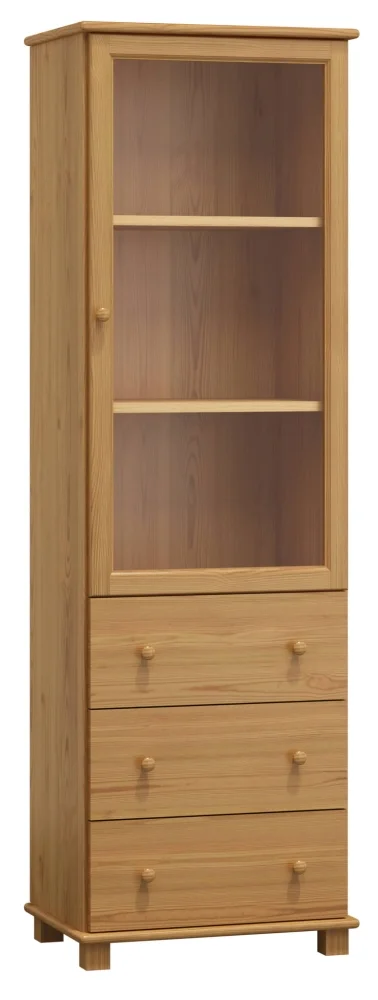 Vitrína se třemi zásuvkami představuje praktické úložné řešení pro obývací pokoj či chodbu. Zhotovena z masivu borovice a povrchově upravena mořidlem v odstínu olše, propůjčuje interiéru přírodní a teplý vzhled. Rozměry činí 190 cm výšky, 60 cm šířky a 42 cm hloubky, což nabízí dostatek místa pro dekorace i běžné předměty. K dodání v demontu, s jednoduchou montáží a stabilní konstrukcí, která vydrží dlouhá léta.