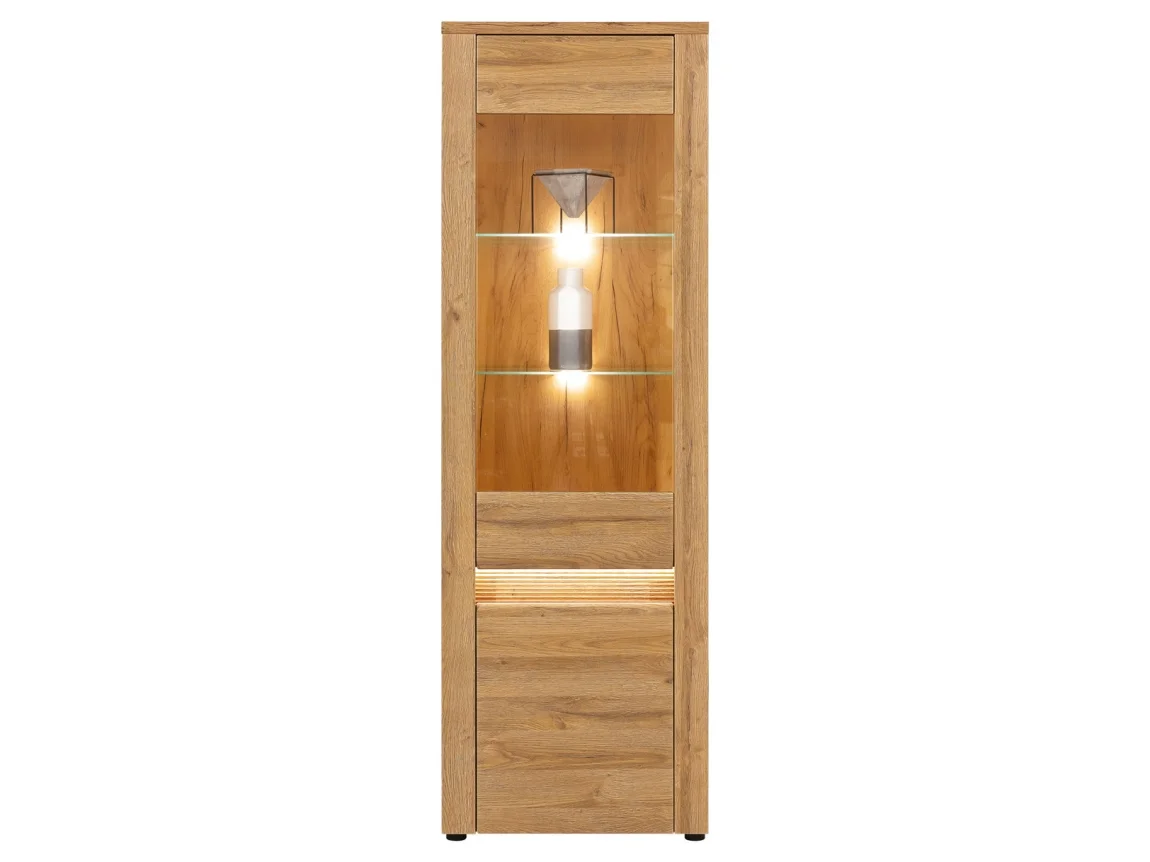 Vitrína SHERKAN s bezúchytovým otevíráním působí čistým a moderním dojmem v dekoru dub Granson. Dvířka lze montovat na levou i pravou stranu, takže uspořádání prostoru si můžete snadno přizpůsobit.