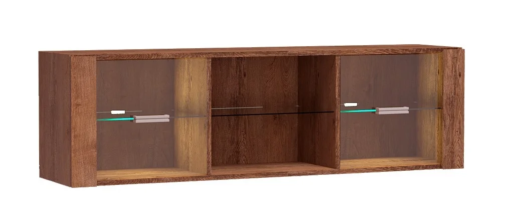 Moderní závěsná vitrína SWED S21 v dekoru jasan světlý kombinuje eleganci s praktickým uspořádáním. Po bocích jsou prosklená dvířka a uvnitř naleznete tři police, jedna za každými dveřmi a další ve střední části.