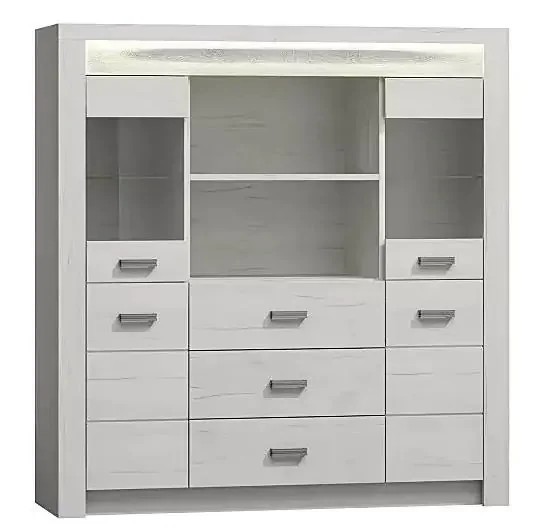 Vitrínová komoda z kolekce INDIANAPOLIS I-22 v provedení jasan bílý kombinuje moderní styl s promyšleným vnitřním uspořádáním. Ze stran najdete dvě vitríny a dvě skříňky, za nimiž je každá polička; uprostřed pak tři zásuvky a nad nimi další polička.