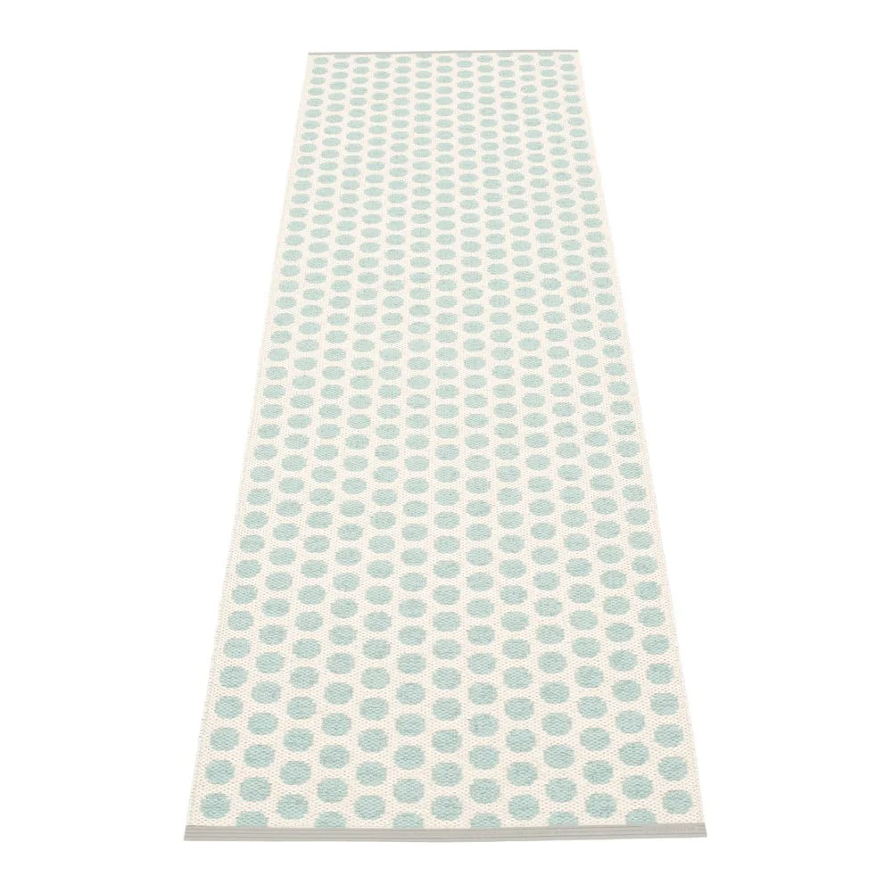 Vnitřní a venkovní běhoun Noa v osvěžující mentolové barvě je ideální volbou pro moderní i tradiční interiéry i exteriéry. Tento koberec od značky Pappelina přináší jedinečný vzhled inspirovaný industriálními gumovými podlahami, který je zvýrazněn jemnými tečkami a kontrastním okrajem, čímž vytváří elegantní a sofistikovaný dojem.