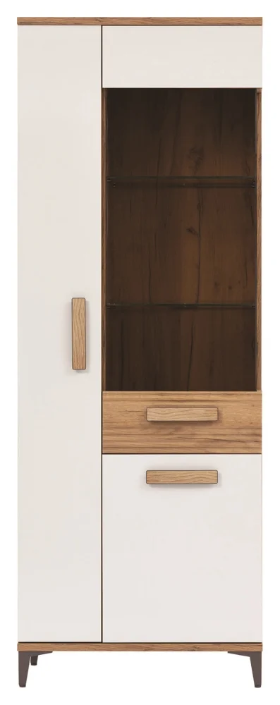 Vysoká vitrína ANTIOPE 3D spojuje dub craft zlatý s bílým alpským leskem pro elegantní i praktický vzhled. Rozměry 72,5 x 197 x 39,5 cm poskytují dostatek místa pro vaše exponáty a přehledné uspořádání.