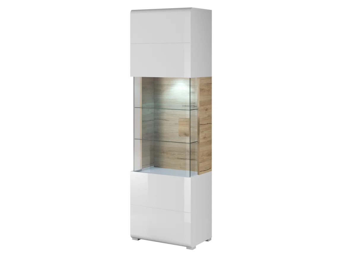 Vysoká vitrína HAMAL – dub San Remo / bílý lesk Regály