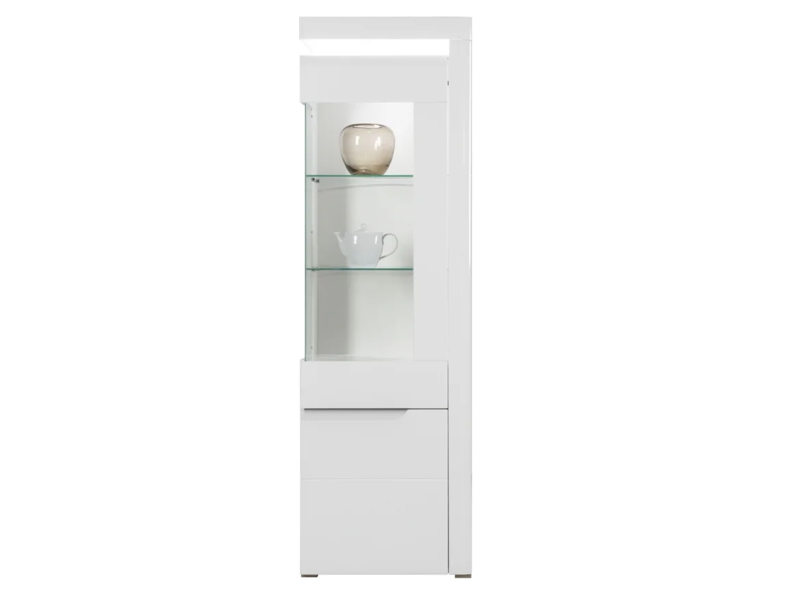 Vysoká vitrína Mandolín je provedena s pravými dveřmi a nabízí elegantní bílé vysoké lesklé čelo i korpus. Korpus z lamina tloušťky 16 mm doplňují dvířka z MDF o tloušťce 18 mm potažená PVC folií; hrany jsou ABS 0,5 mm a panty 35 mm jsou nastavitelné ve třech osách, aby dokonale sedla i na nerovném podkladu.