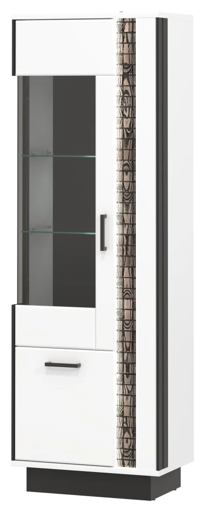 Vysoká vitrína SIGOURNEY 2D v levém provedení kombinuje bílé a černé plochy s lesklými dvířky a dodává interiéru moderní vzhled. Rozměry 63,5 x 192 x 39,5 cm zajišťují dostatek prostoru pro vystavení i ukládání věcí.