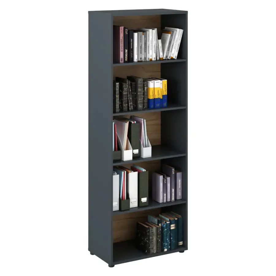 Vysoký regál Klaudius Typ 1 vás zaujme svým bohatým úložným prostorem a elegantním nádechem, který zapadne do různých kancelářských stylů. Čtyři police vytvářejí pět oddělených přihrádek, takže budete mít veškeré pořadače, dokumenty i literaturu přehledně na dosah. Regál je vyroben z laminované DTD, barevné provedení grafit/dub artisan působí moderně a nadčasově. Nosnost jednotlivé police dosahuje 5 kg a pevné kovové nohy zajišťují stabilitu i v náročném provozu. Rozměry jsou 70 x 40 x 196,4 cm; tloušťka materiálu 1,6–2,2 cm. Dodáváno v demontu. Vytvořte si podle svých představ atmosféru pohodlné a organizované pracovní zóny se sektorovým nábytkem Klaudius.