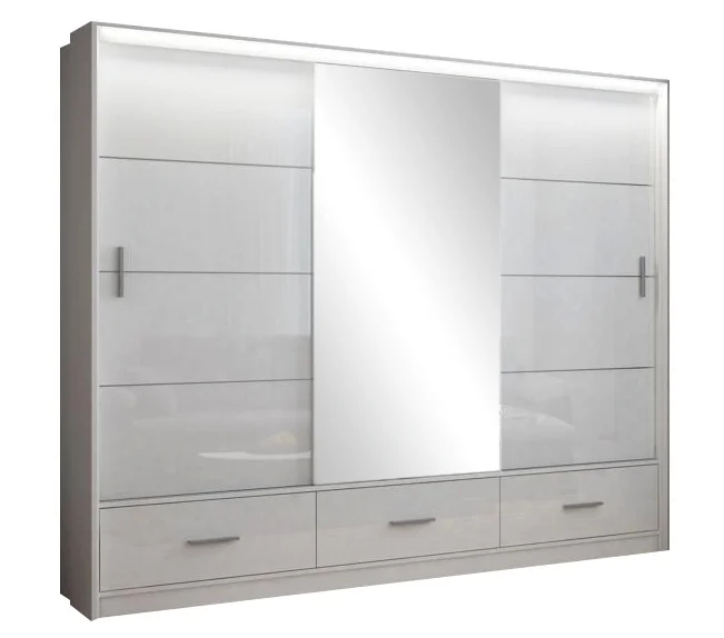 Šatní skříň Wardane 250 v bílé variantě se pyšní vestavěným LED osvětlením a moderním vzhledem. Dveře jsou posuvné, což šetří prostor a usnadňuje každodenní používání. Korpus i dvířka jsou vyrobeny z kvalitního LTD v bílé barvě; prostřední dveře obsahují zrcadlo a boční části působí lesklým bílým vzhledem.