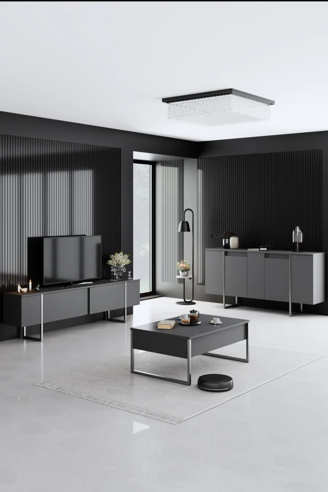 Proměňte svůj obývací pokoj v luxusní a moderní prostor díky sadě WELTRIS 3. Sestava je vyrobena z 18 mm tloušťky melaminem potažené dřevotřísky, která je odolná a snadná na údržbu. Kovové nohy dodávají nábytku lehký moderní nádech a zajišťují stabilitu. Do balení patří televizní stojan s širokou plochou pro televizi a multimediální techniku, spolu s konferenčním stolkem a konzolou, které nabídnou dostatek úložného prostoru pro vaše potřeby. Kombinace antracitové a stříbrné barvy působí elegantně a nadčasově, čímž vytváří příjemnou a lákavou atmosféru pro vás i vaše hosty. Díky hladkým povrchům a odolnému materiálu je údržba jednoduchá a úklid rychlý. Nepropásněte příležitost proměnit svůj prostor v luxusní útulné místo, kam se budete rádi vracet.