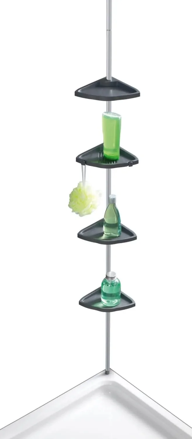 Praktické řešení pro efektivní uspořádání koupelnových potřeb, vhodné do sprchových koutů, van nebo volně v koupelně. Tento patrový regál nabízí čtyři odolné police, které usnadní skladování šamponů, mýdel a dalších hygienických pomůcek. Díky teleskopické tyči s rozsahem od 78 do 265 cm je instalace rychlá, pevná a bezpečná, přičemž její stříbrná barva snadno zapadne do jakéhokoliv koupelnového designu.