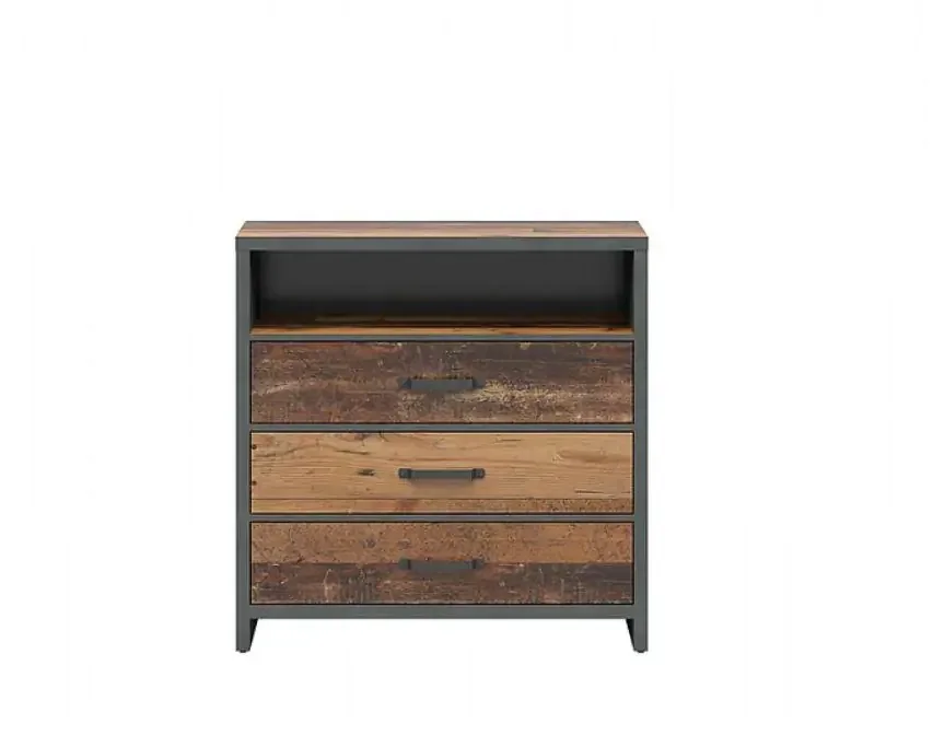 Komoda WESTON KOM3S nabízí tři zásuvky a jednu otevřenou polici pro praktické ukládání nezbytností. Je vybavena systémem plynulého výsuvu a je vyrobena z laminátu s pevnými, výrazně zesílenými hranami. Úchytky usnadňují manipulaci a otevírání, dodáváme ji v demontovaném stavu s návodem na montáž. WESTON skvěle doplní další kousky této kolekce a hodí se do studentských pokojů i do obývacích či pracovních prostor, kde podtrhuje industriální vzhled a praktické řešení úložného prostoru.