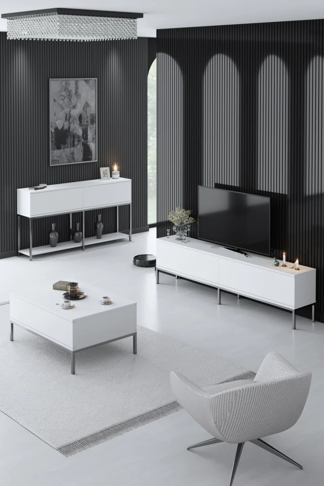 Kovové nohy dodávají nábytku moderní charakter a zajišťují stabilitu. Televizní stolek má šířku 180 cm, výšku 47 cm a hloubku 30 cm; konzola šířku 150 cm, výšku 80 cm a hloubku 30 cm; konferenční stolek má šířku 90 cm, výšku 40 cm a hloubku 60 cm. Tato nadčasová kombinace bílé a stříbrné barvy působí elegantně a snadno se sladí s jakýmkoli interiérem. Snadná údržba a vysoká odolnost vůči poškrábání dělají z této sestavy praktickou volbu pro každodenní použití. Objednejte si WINSON a dopřejte si komfort, styl a funkčnost pro sledování televize, odpočinek i společné chvíle s hosty.