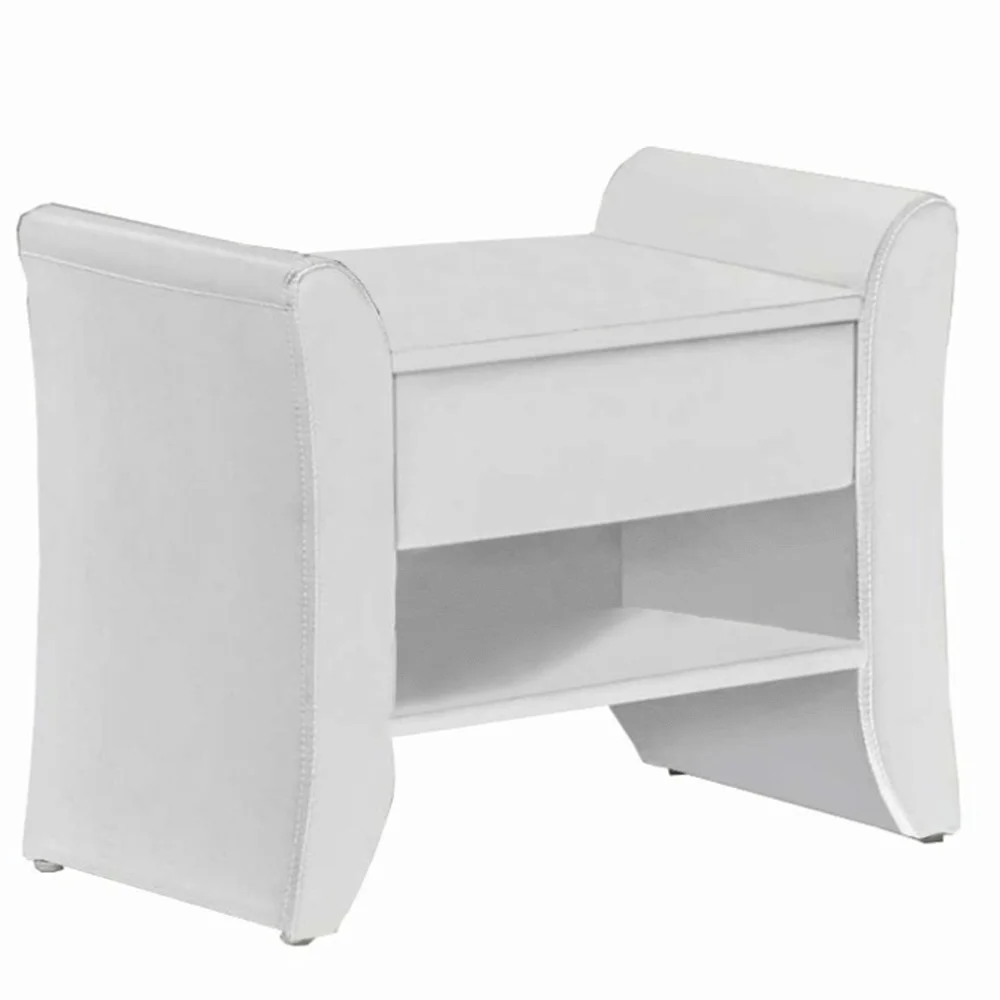 Elegantně čalouněný noční stolek v bílém provedení vytváří příjemný dotek a zároveň nabízí praktický úložný prostor. Má jednu poličku a šuplík, kam snadno uložíte knihy, brýle či drobnosti.