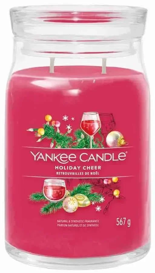 sváteční atmosféru s velkou vonnou svíčkou Yankee Candle Signature Holiday Cheer. Tato vůně kombinuje osvěžující tóny ostružinového vína s teplým kardamomem a sladkou vanilkou, obohacenou o hloubku ambry a tonka bobů. Díky použití kvalitního sójového vosku a elegantní skleněné dóze s ručně ilustrovaným štítkem je tato svíčka nejen krásná na pohled, ale také ekologická a šetrná k životnímu prostředí.