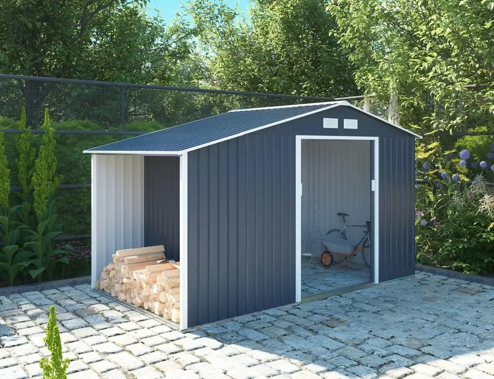 Domek nabízí dvojité posuvné dveře, které usnadní vstup i při plném vybavení interiéru. Konstrukce je vyrobena z ocelových plechů tloušťky 0,25–0,30 mm a rám z pozinkované oceli tloušťky 0,5–0,8 mm, což zajišťuje pevnost a odolnost vůči povětrnostním vlivům. Max. zatížení střechy sněhem činí 60 kg/m², takže domku neublíží sněhová zátěž. Ventilační mřížky v konstrukci umožňují proudění vzduchu a minimalizují vlhkost uvnitř. Podlaha není součástí balení; je potřeba postavit domek na rovný základ (beton, dlaždice, dřevěná podlaha) a součástí balení je obvodový rám spolu s kotevním materiálem. Domek lze sestavit s přístřeškem pro dřevo buď vlevo, nebo vpravo; volba je tedy flexibilní. Dodáváno v demontu.
