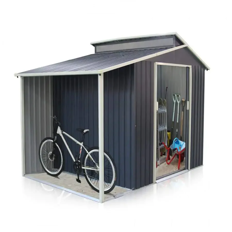 Praktický zahradní úložný prostor pro nářadí, sekačku a další doplňky, s integrovaným přístřeškem na kola. Konstrukce z ocelových plechů s pozinkovaným povrchem zajišťuje dlouhou životnost i při náročných povětrnostních podmínkách. Dveře jsou dvojité a posuvné, což usnadňuje vstup a manipulaci s objemnějším vybavením. Domek nemá podlahu a díky ventilaci ve formě mřížek je zajištěná pravidelná cirkulace vzduchu. Pro bezpečí lze domku uzamknout visacím zámkem (zámek není součástí balení). Rozměry: výška 229 cm, šířka 292 cm, délka 129 cm; hmotnost 67 kg; barva šedá. Balení je kartonové a odpovídá rozměrům 185×71×12 cm. Tento model se hodí do moderní zahrady a poskytuje praktické, spolehlivé a snadno dostupné úložné řešení pro vaši výbavu.