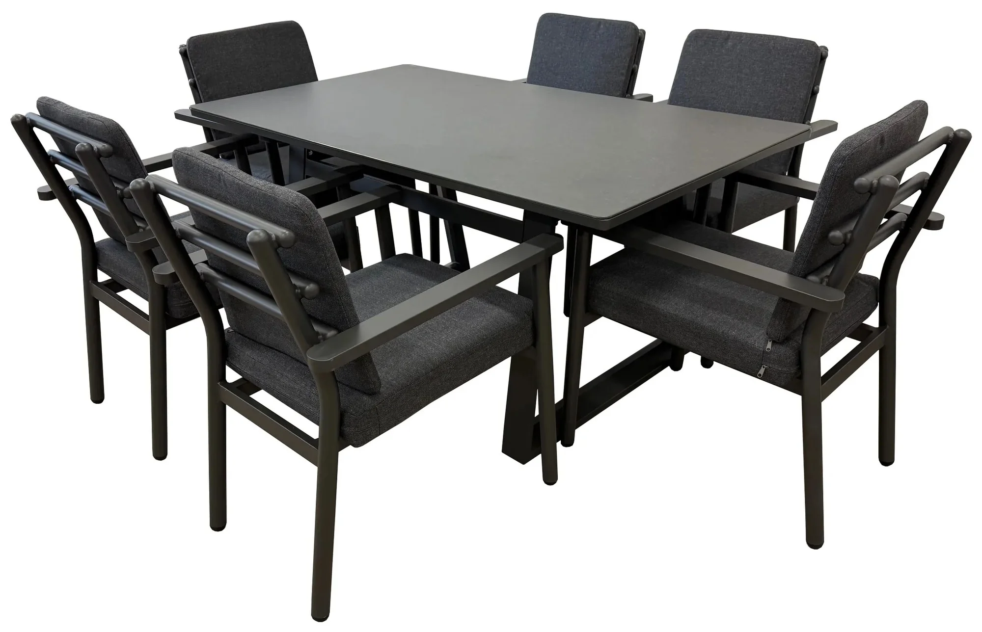 Elegantní a odolná zahradní jídelní sada Ella v tmavě šedém provedení je perfektní volbou pro pohodlné posezení na terase nebo v zahradě. Tento set, ideální pro rodinné obědy, oslav či venkovní večeře, tvoří stabilní konstrukce z kvalitního svařeného hliníku a sestává z rozměrného stolu s tvrzeným sklem a šesti komfortních židlí s polstrováním.