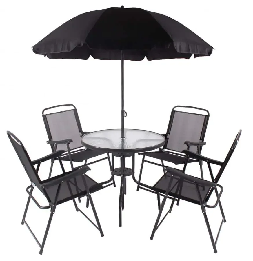 Zahradní sestava MADRID představuje osvědčené řešení pro pohodlné venkovní posezení. Součástí sady jsou čtyři skládací křesla s plastovou loketní opěrkou, kulatý stůl a slunečník. Díky praktickým skládacím křeslům ji snadno složíte a uložíte, šetříte tím prostor. Křesla měří cca 89 cm na výšku, 58 cm na šířku a 62 cm do hloubky a unesou až 100 kg. Stůl má průměr 75 cm a výšku 70 cm, deska z tvrzeného skla tloušťky 5 mm a konstrukce z ocelových trubek. Do stolu je možné vložit slunečník díky otvoru a nosnost otvoru je až 50 kg pro jistotu během větrných dnů. Slunečník má průměr 180 cm, výšku 180 cm, 8 ocelových žeber a nohu o průměru 22/25 mm s tloušťkou 0,8 mm; látka je 140 g/m2 polyesteru. Povrch celé sestavy je ošetřen práškovým lakováním v antracitové barvě, černé potahy z Textilene dodávají moderní vzhled a komfort.
