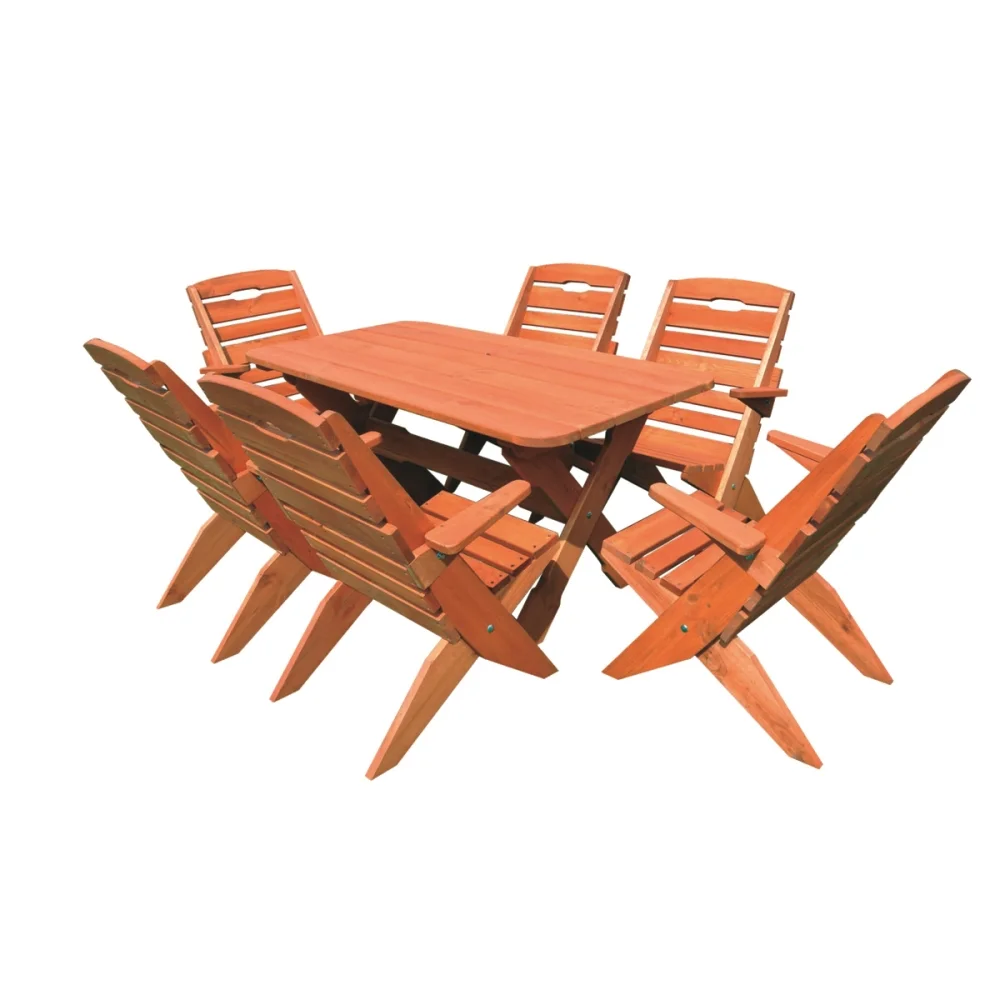 URIKOS zahradní set kombinuje pevné dřevo a stabilní konstrukci pro venkovní posezení, které vydrží i proměnlivé počasí. Sestava obsahuje 6 židlí a 1 stůl, poskytující dostatek místa pro rodinné večeře a setkání s přáteli u grilu.